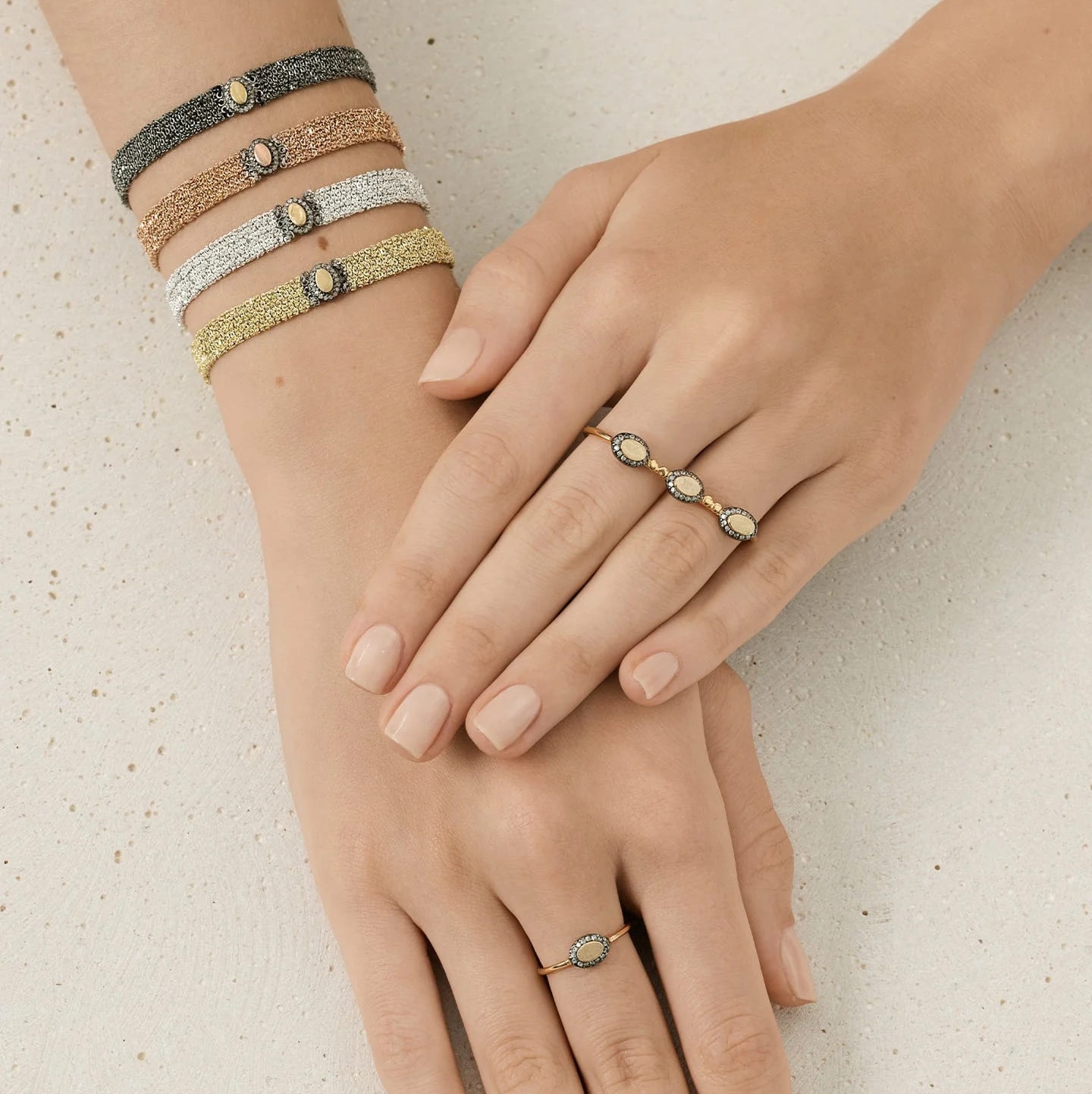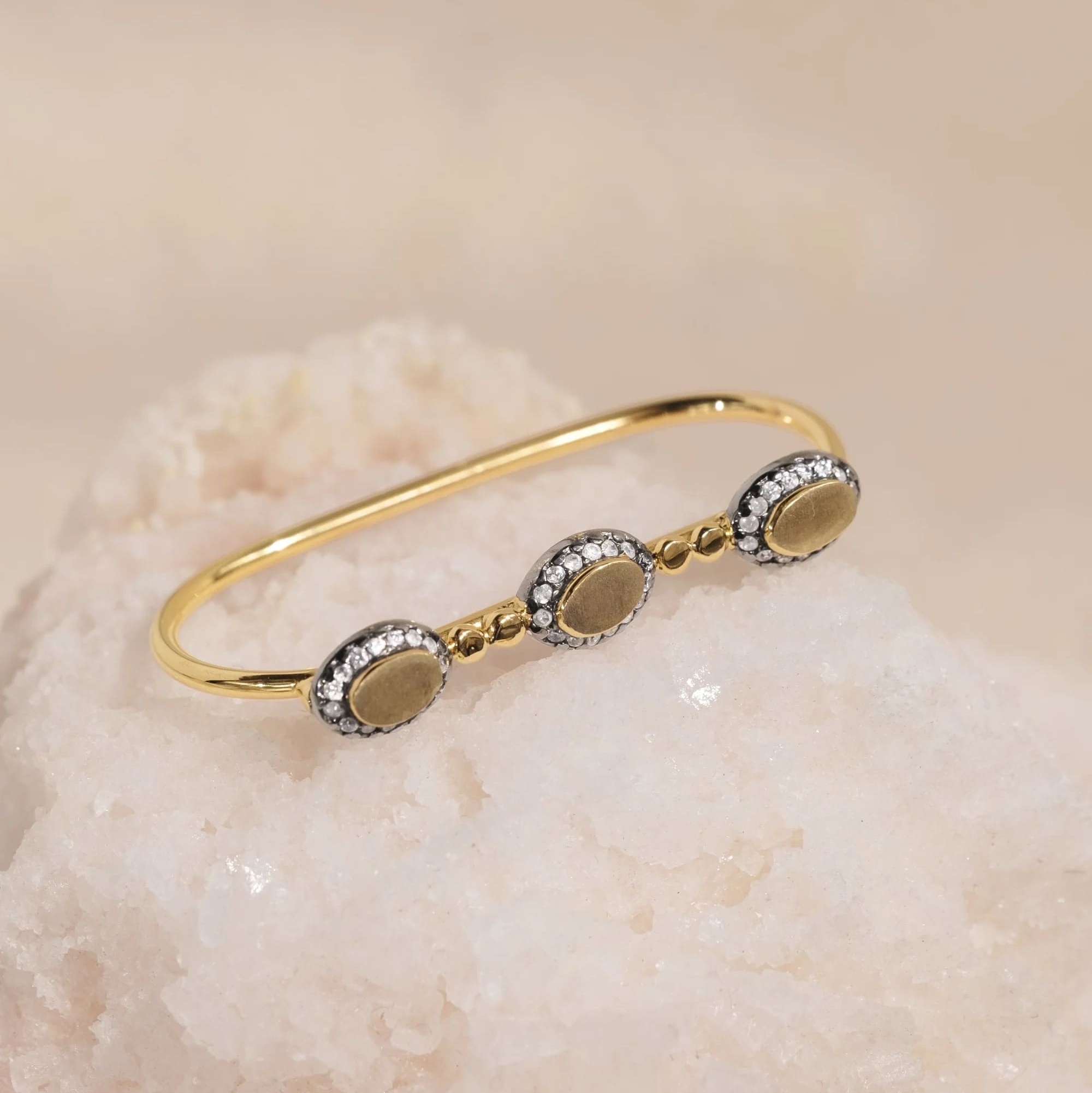Inel cu două degete din argint 925 cu finisaj auriu, împodobit cu trei medalioane și pietre din argint masiv lucrate manual. Fiecare medalion are o piatră din argint masiv cu finisaj auriu satinat, înconjurată de mini diamante neregulate.