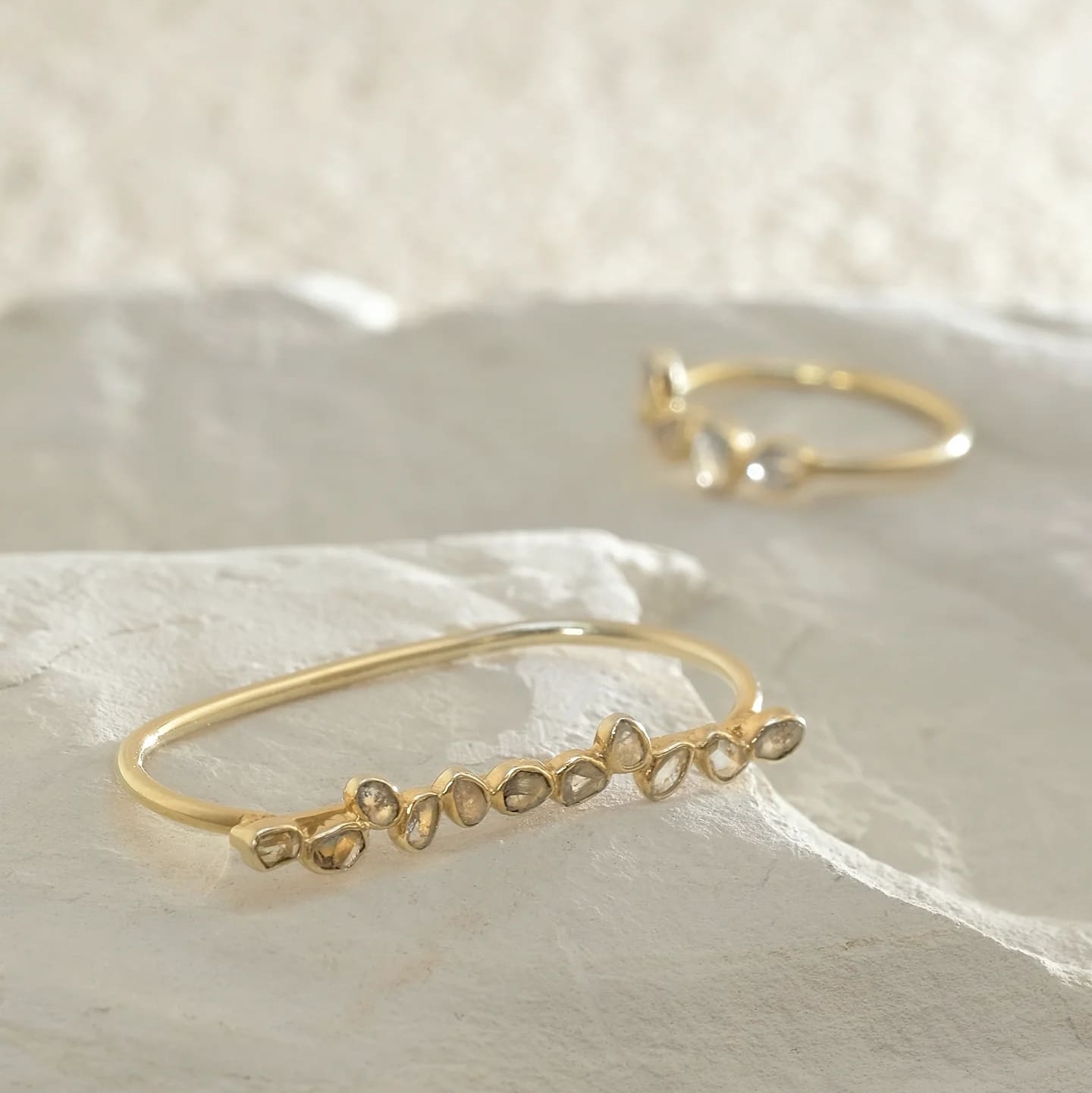Inel cu două degete din argint 925 cu finisaj auriu, încrustat cu un pavé neregulat de diamante Polki.