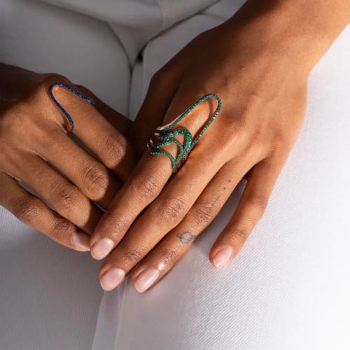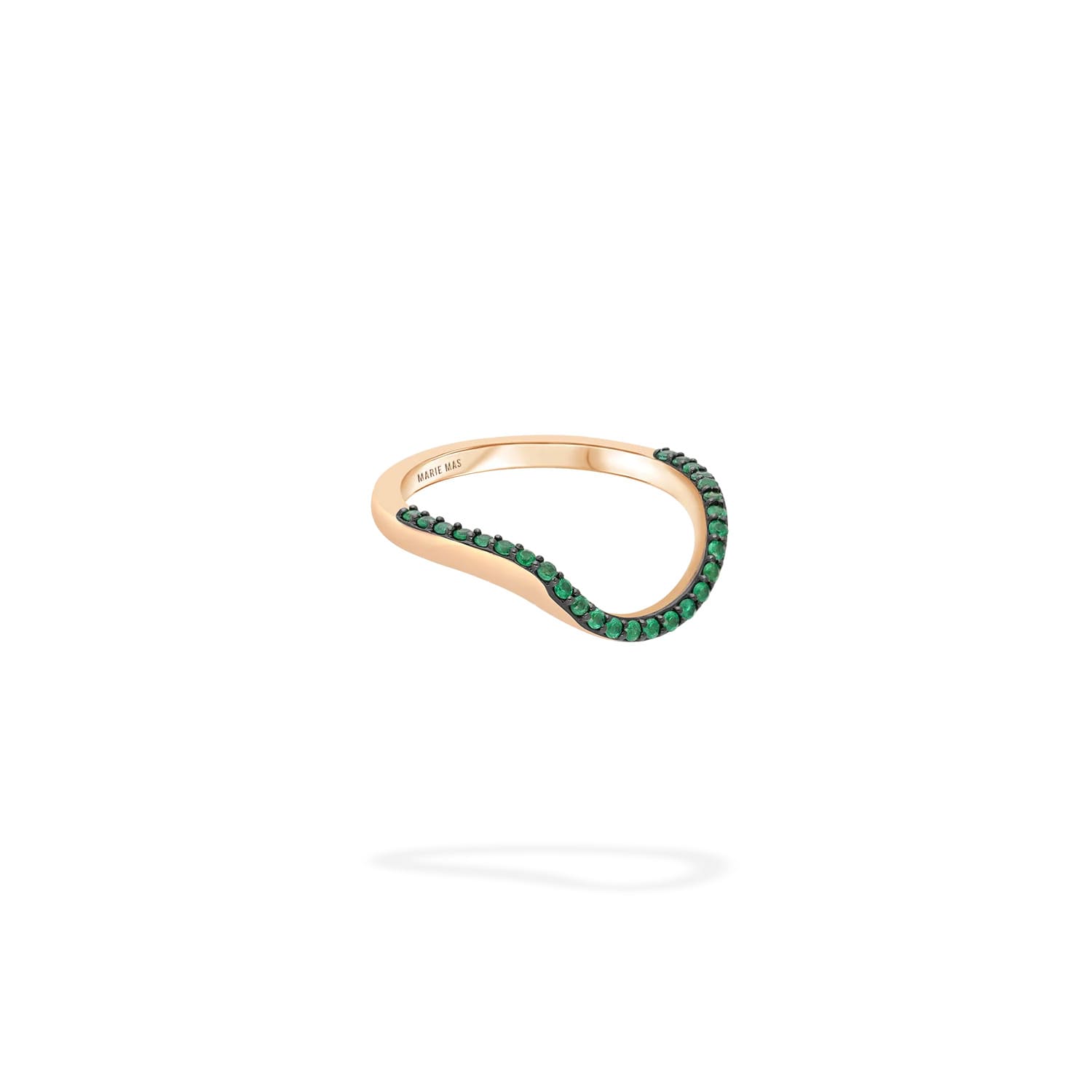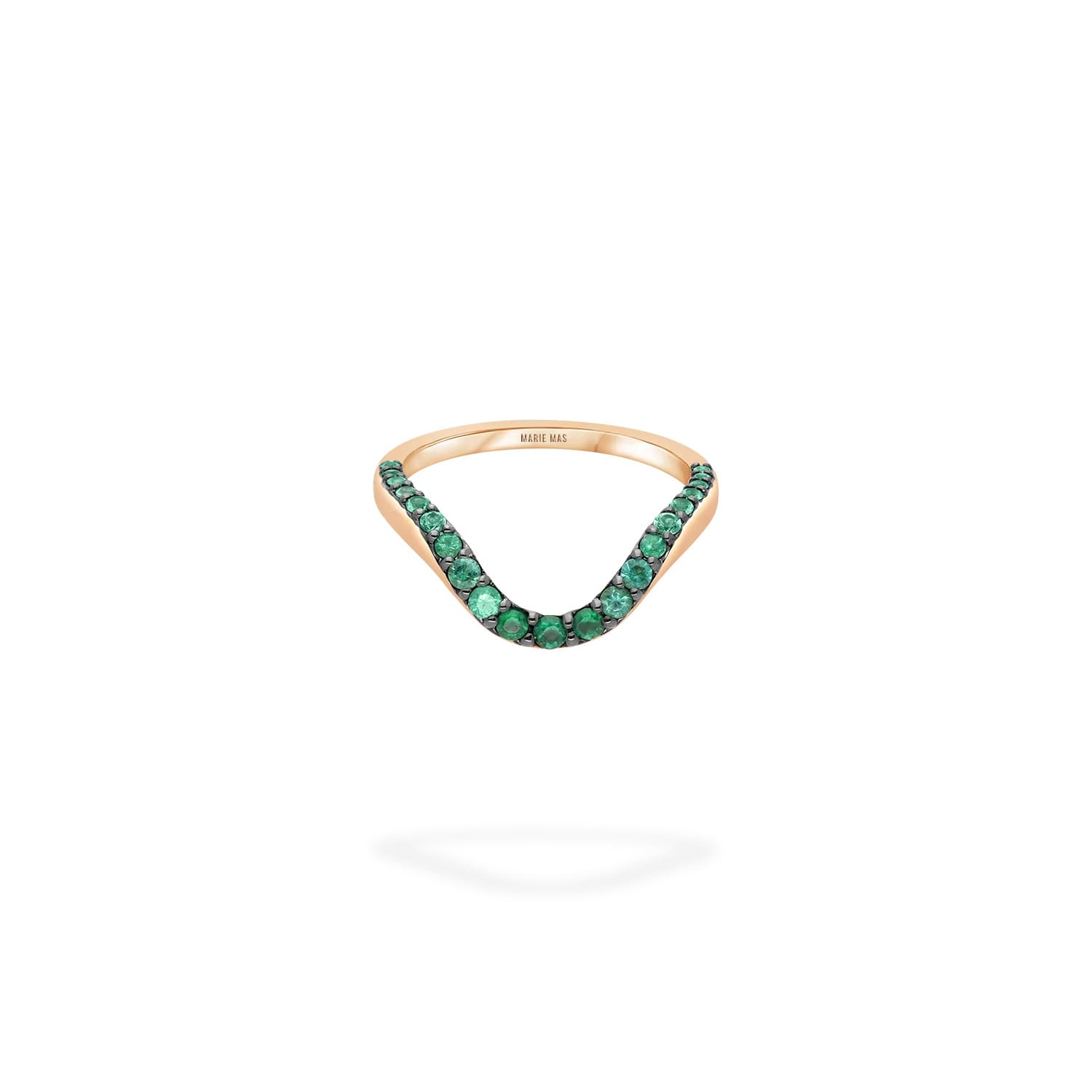 Add to WishlistRealizat din aur roz de 18k, inelul este încrustat cu 27 de smaralde în partea superioară, cu o greutate totală de 0,22 ct.