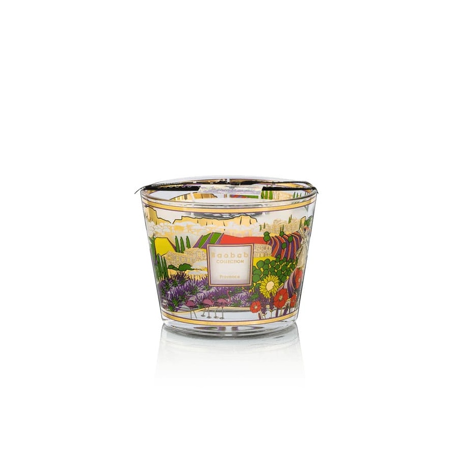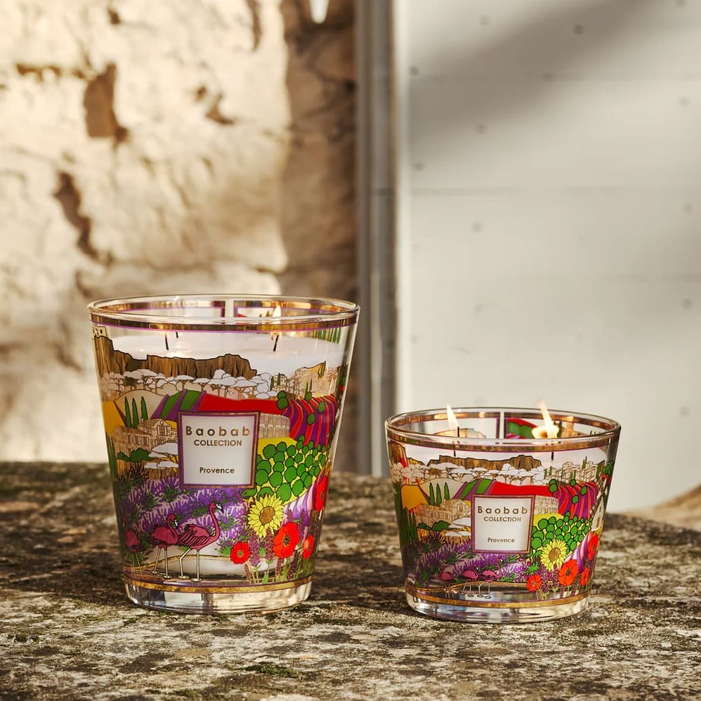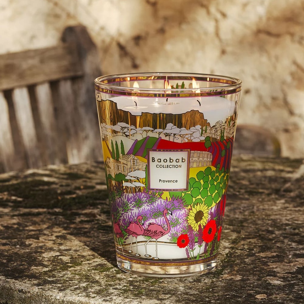 Inspirată de imaginația plină de culoare a lui David Hockney, lumânarea Provence prezintă o serigrafie cu aur de 24 de carate aplicată manual, care transformă peisajele iconice într-o cartografie jucăușă și luminoasă. Baux-de-Provence, Abația din Sénanque, fermele înconjurate de chiparoși și elegantul castel din Lourmarin se suprapun ca paginile unui jurnal de călătorie, în timp ce flamingii adaugă farmecul capricios al Camarguei.