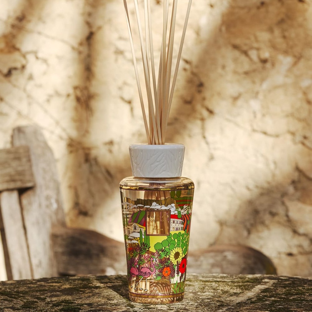 Inspirat de imaginația plină de culoare a lui David Hockney, difuzorul Provence prezintă o serigrafie cu aur de 24 de carate aplicată manual, care transformă peisajele iconice într-o cartografie jucăușă și luminoasă. Baux-de-Provence, Abația din Sénanque, fermele înconjurate de chiparoși și elegantul castel din Lourmarin se suprapun ca paginile unui jurnal de călătorie, în timp ce flamingii adaugă farmecul capricios al Camarguei.
