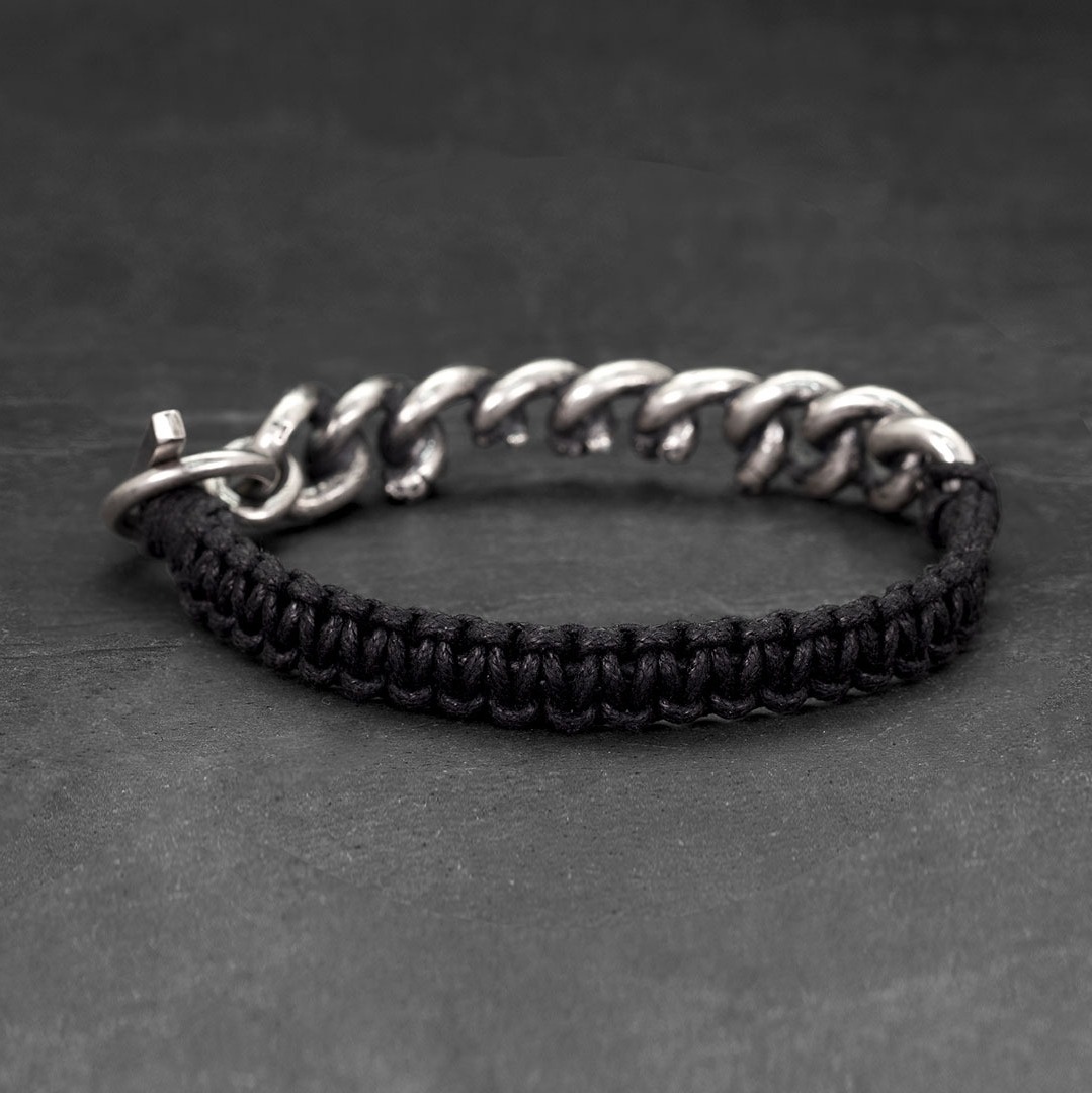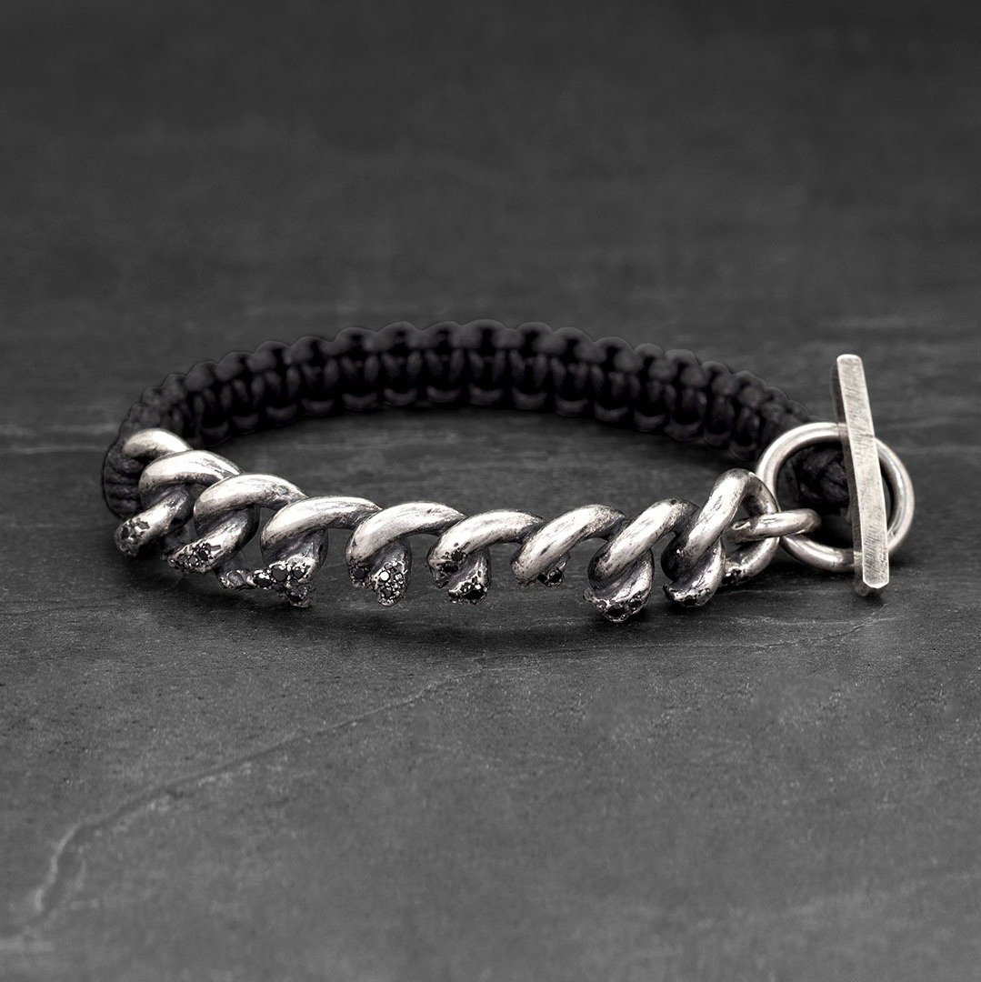 925 silver chain adorned with black diamonds and braided with black cotton cord.