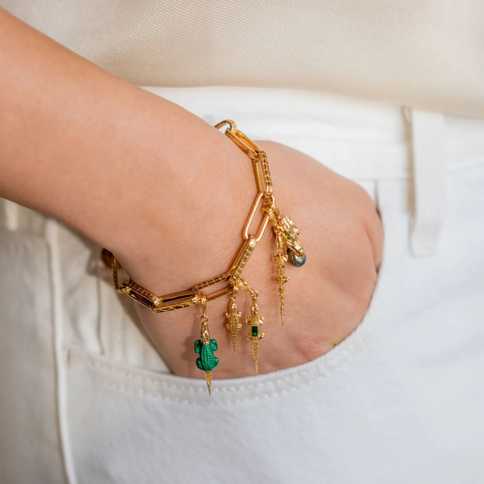 This powerful charm fuses polished 18k yellow gold with hand-carved malachite – stone of transformation and protection. The alligator, half-golden and half-veiled in lush green, reminds us that strength can be both fierce and regenerative. Malachite’s swirling depths speak of emotional wisdom and rebirth, while the gold tail and snout gleam with unwavering resilience. A talisman for those navigating change, guided by instinct, and rooted in ancient power.