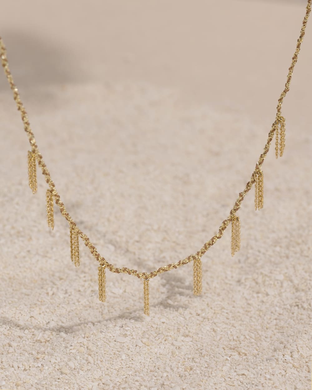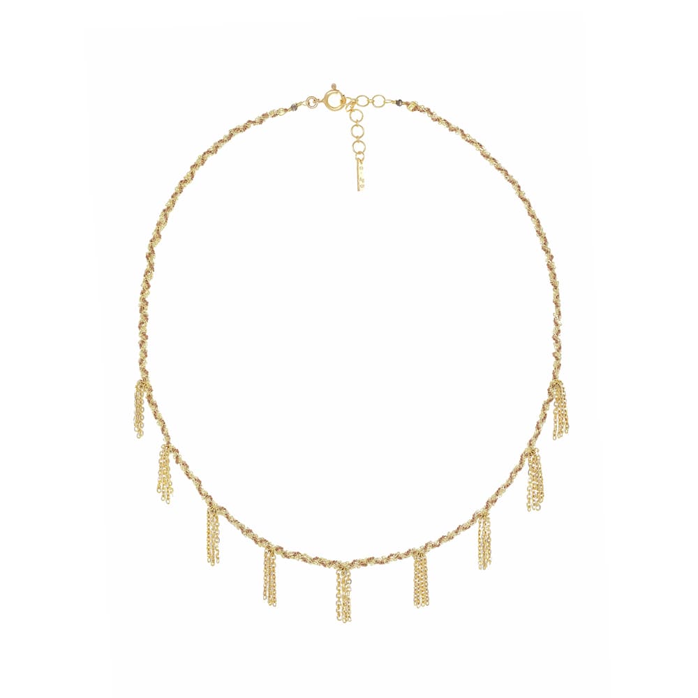 Add to WishlistShort braided necklace in 925 Sterling silver with a gold finish, made of chains and beige silk yarns. Mini chain tassels complete the design, creating a subtle play of light.