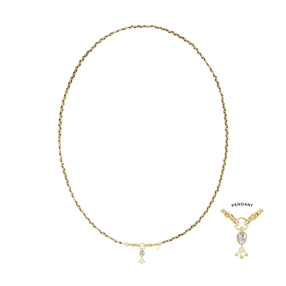 Add to WishlistNecklace in 925 Sterling silver with a gold finish, featuring a braid of chains and brown silk yarns. It is adorned with a pendant set with a Polki diamond and three delicate mini bells. The necklace fastens with two lobster clasps, ensuring a secure and elegant fit.