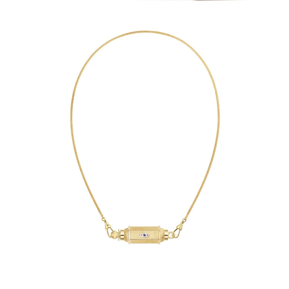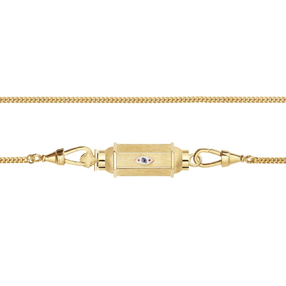 Add to WishlistThin barrel pendant in yellow gold, adorned with three enameled evil eyes, each containing one blue sapphire.