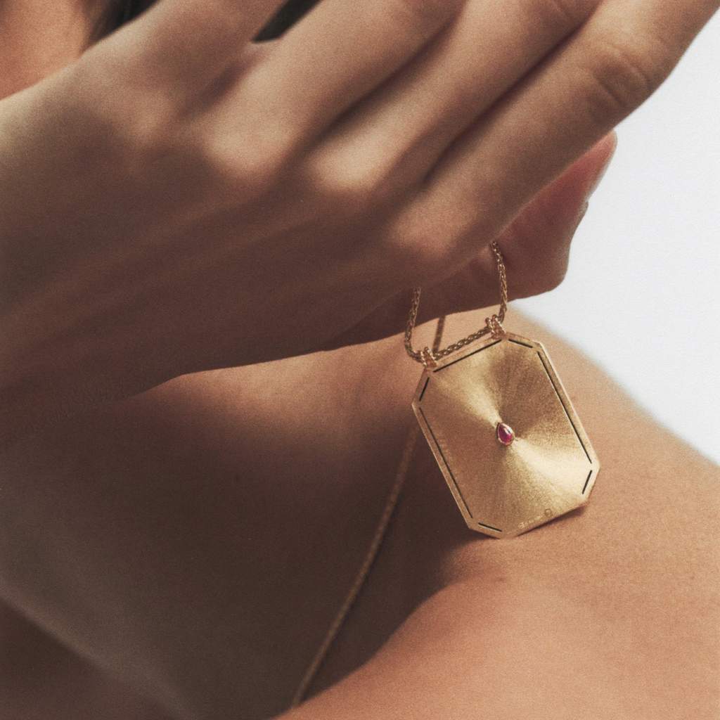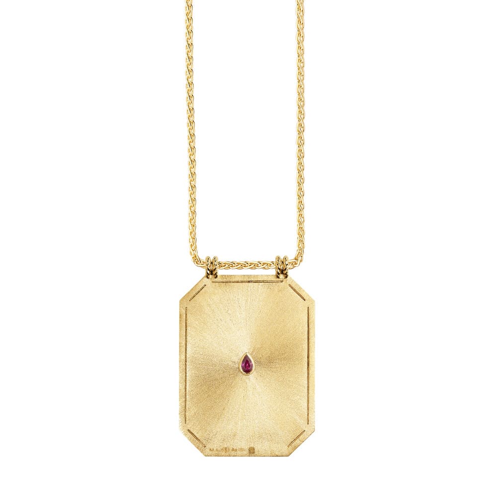 The frame of the scapular is adorned by an engraved frieze and a pear cut ruby adorns the back of it.