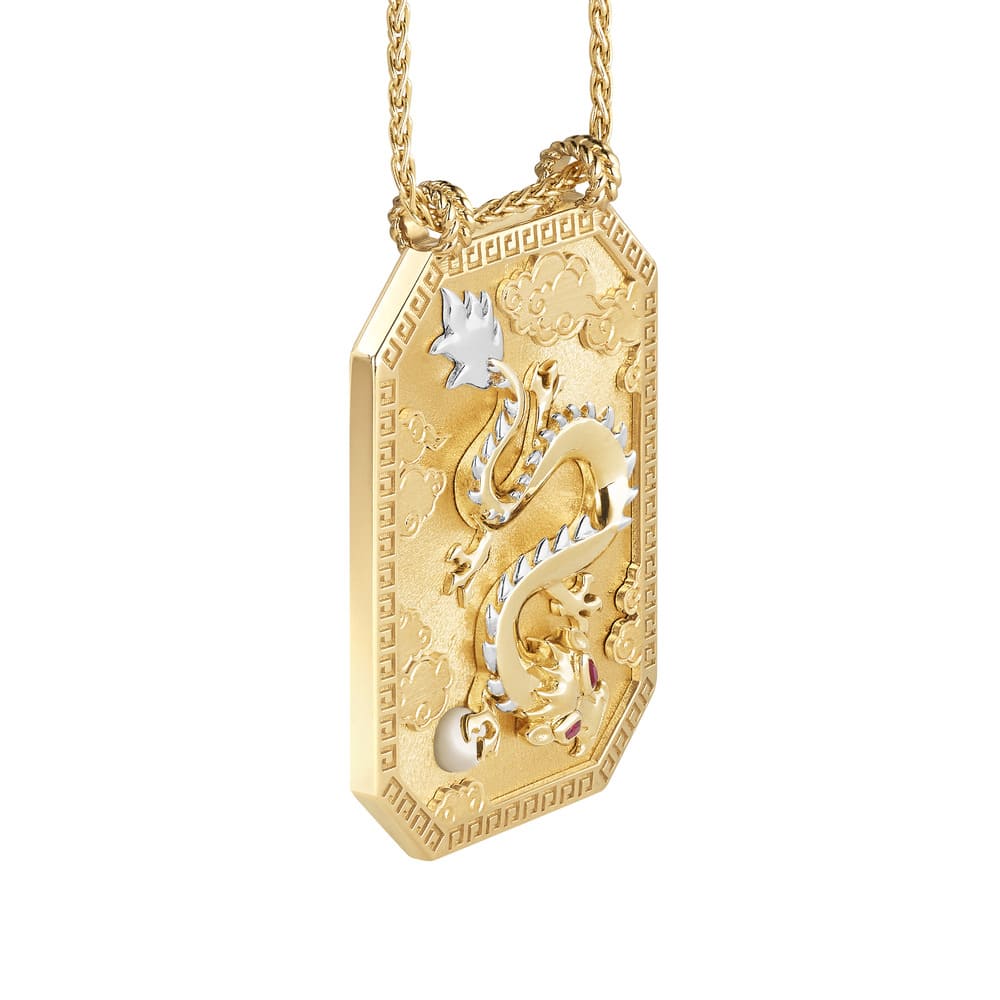 Add to WishlistGrand yellow gold scapular, adorned with clouds and a dragon, whose eyes are set with two pear cut rubies ; his claws holds a white pearl.