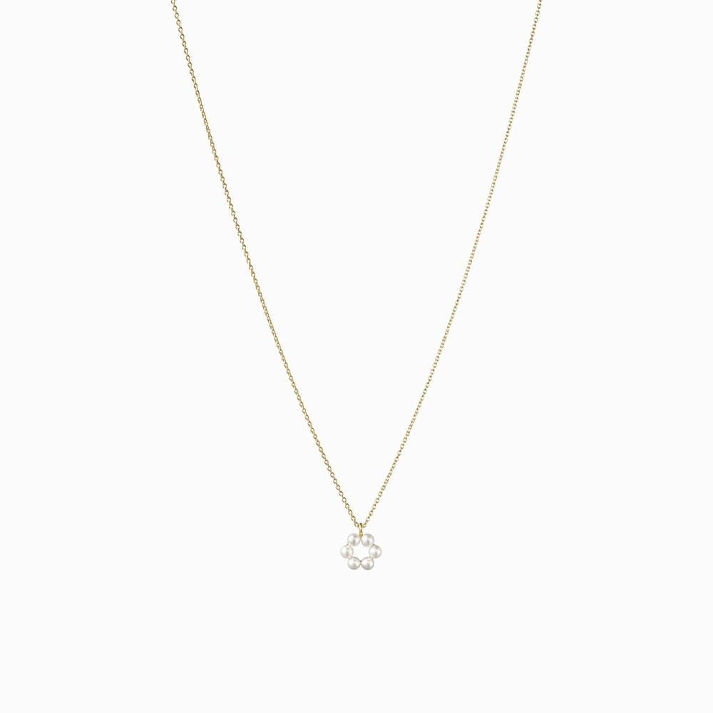 With the Luna Perle necklace, a delicate arrangement of freshwater pearls forms a soft, circular cluster resembling a flower. The pendant is placed loose on the chain, allowing it to move freely when the necklace is worn.