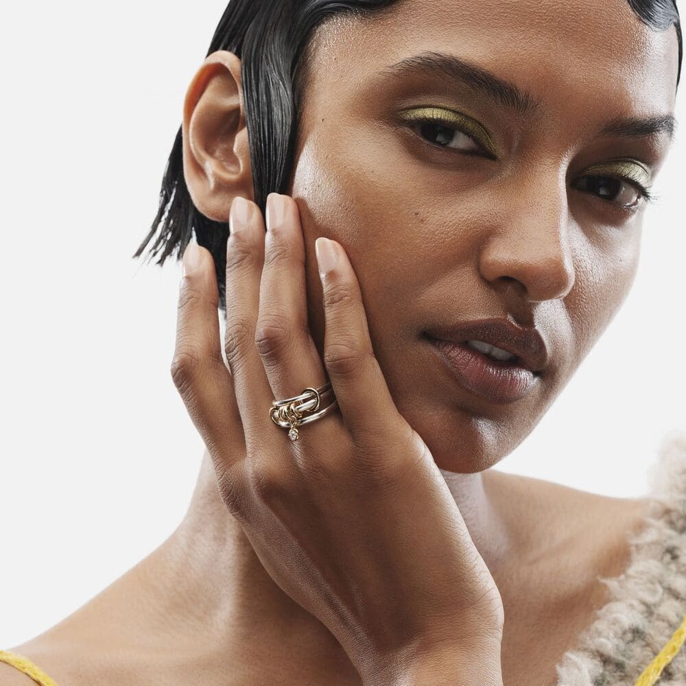 Add to WishlistThe Piera linked ring is comprised of three linked bands and features a trio of annulets with a central drop charm. Each ring in either 18k gold or .925 sterling silver is paired with a bezel-set stone in striking contrast and tactile appeal. Each Piera linked ring is individually handmade in Los Angeles.
