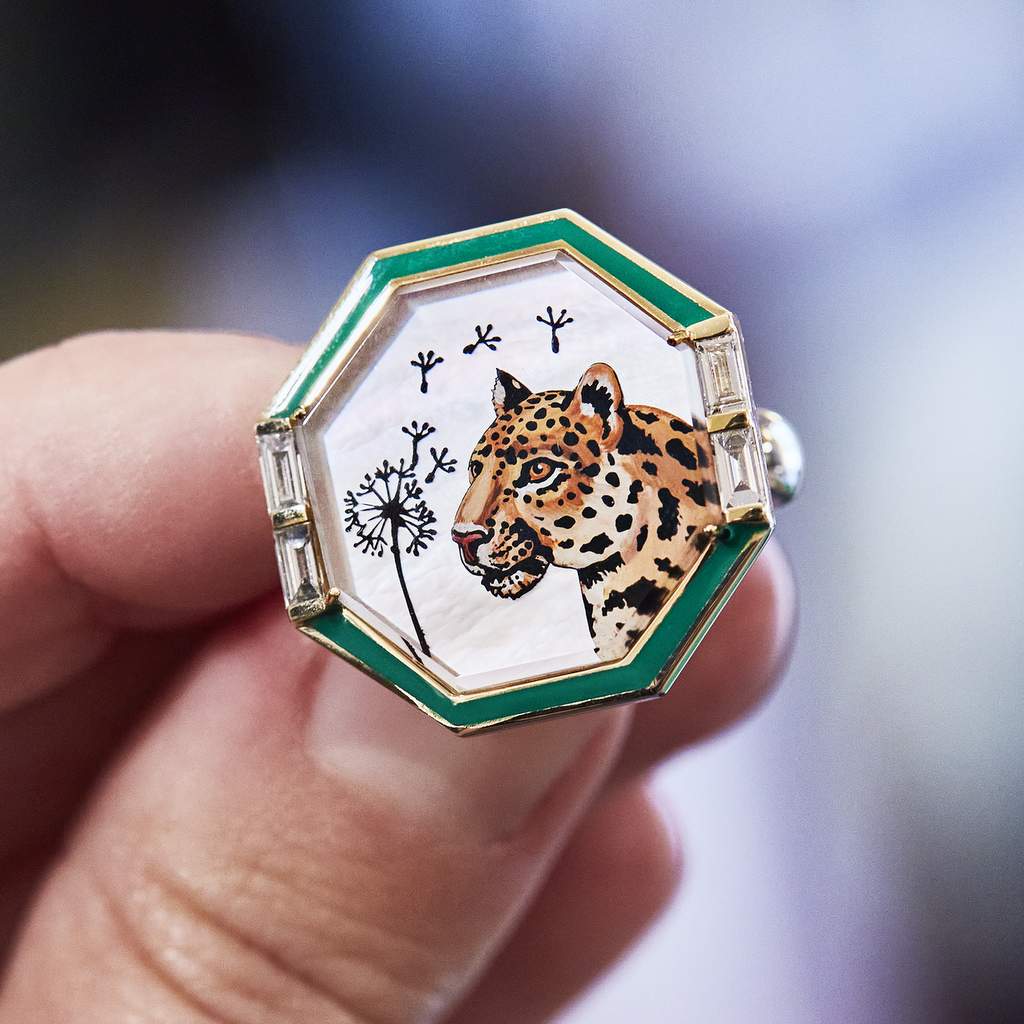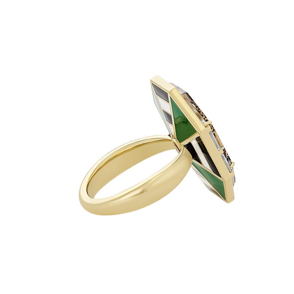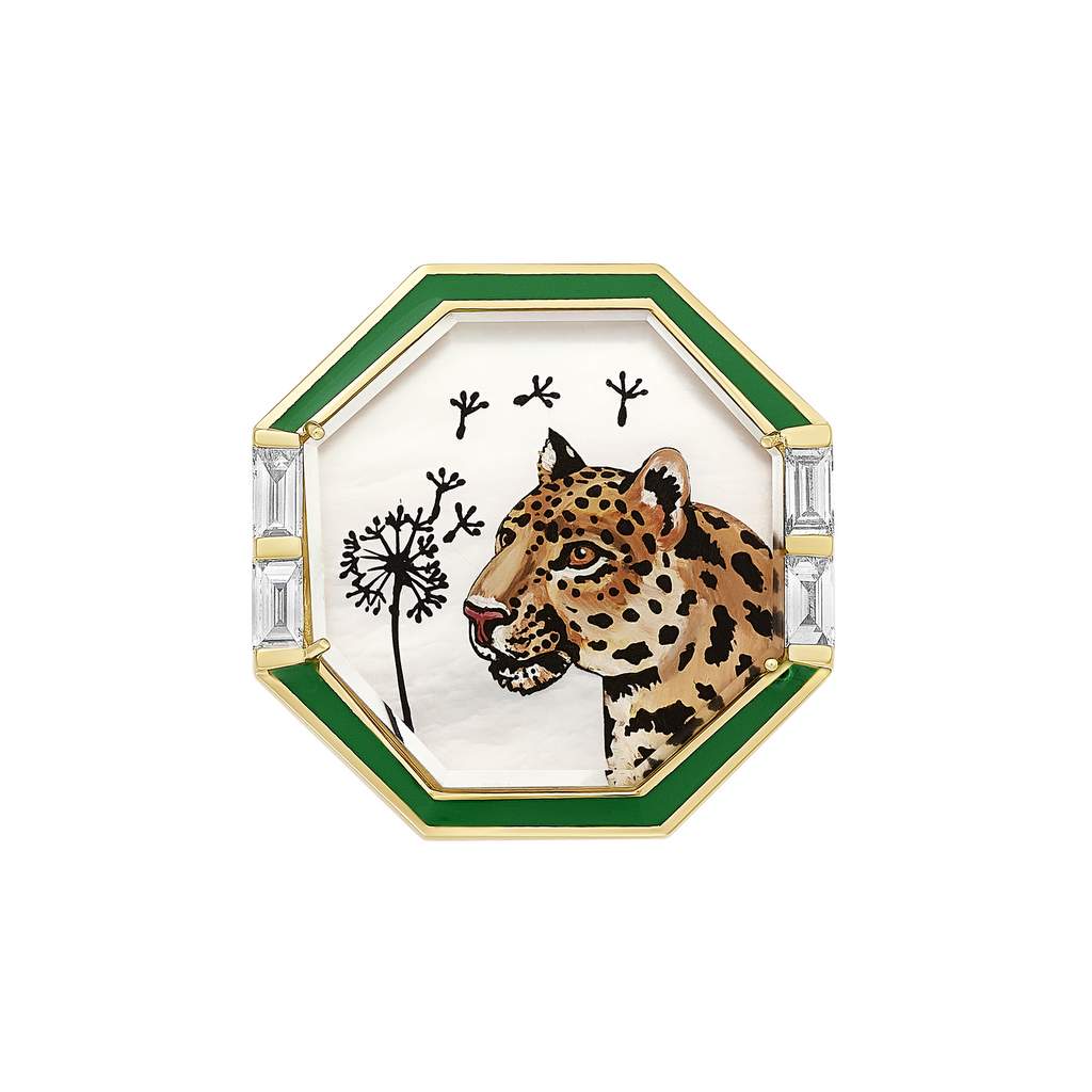 The leopard is hand-carved and painted on the reverse of a faceted rock crystal, and backed with mother of pearl. The crystal is set in 18k gold and decorated with a green enamel and diamond baguette frame. The underside of the ring is decorated with a geometric enamel pattern and set with a ruby.