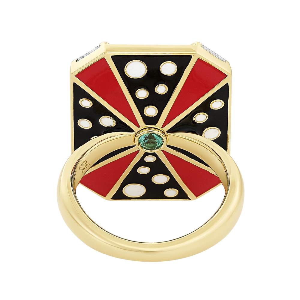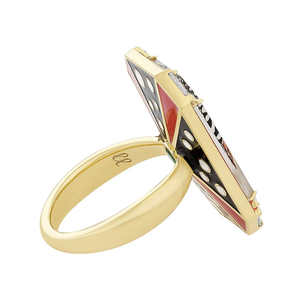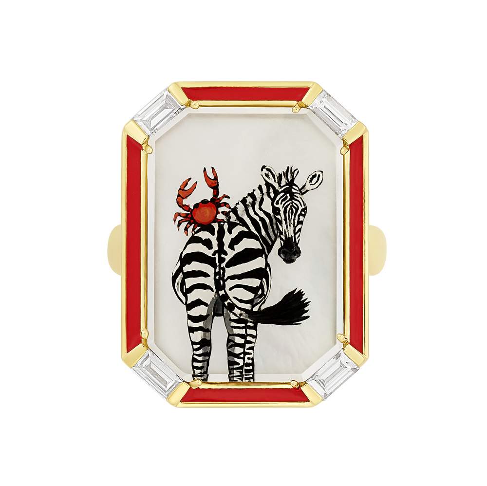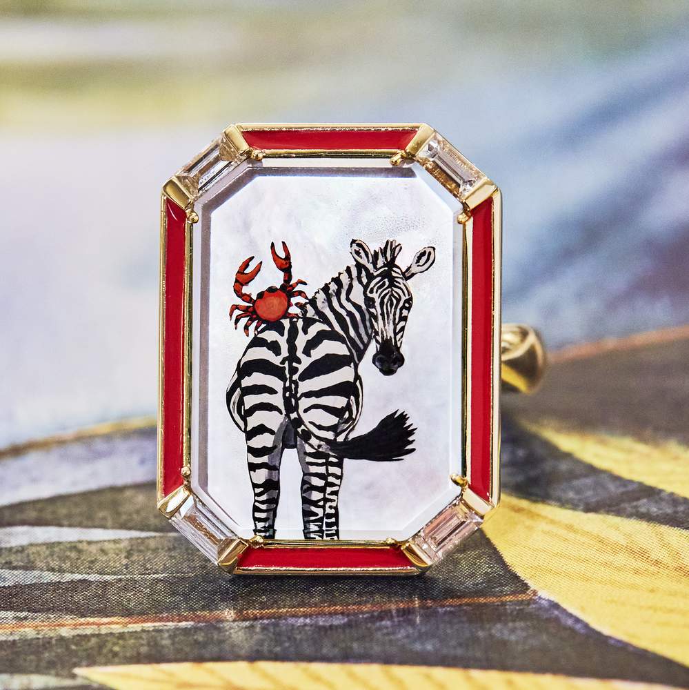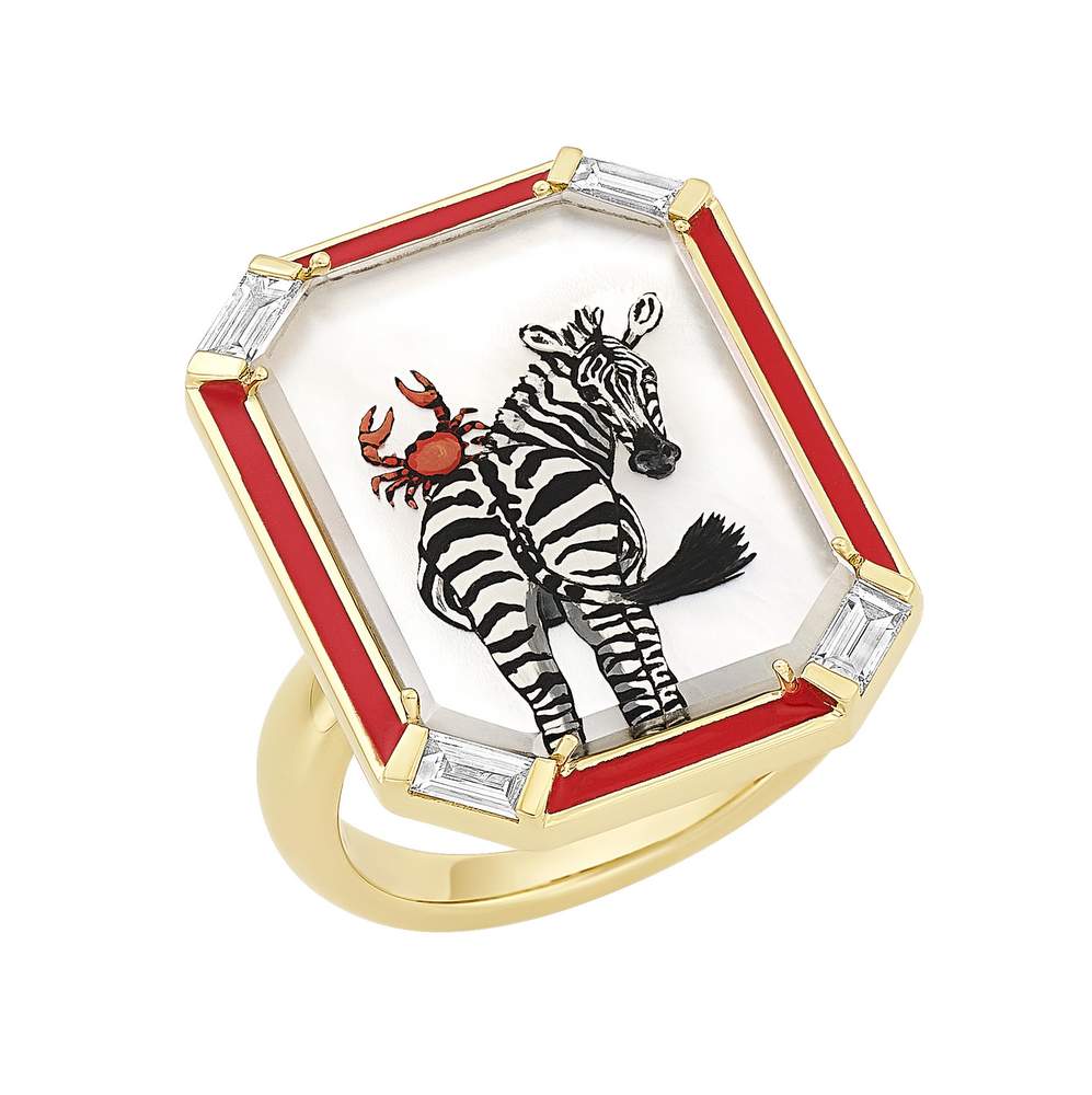 The zebra is hand-carved and painted on the reverse side of a faceted rock crystal, and backed with mother of pearl. Set in 18k gold and decorated with red enamel and diamond baguettes. The underside of the ring is decorated with a geometric enamel pattern and set with an emerald.